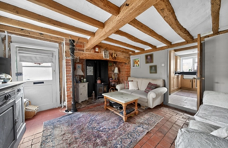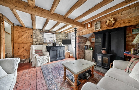 Upon entering, you are welcomed into a cosy sitting room, rich in character and warmth. Stunning exposed beams, terracotta tiled flooring and an impressive inglenook fireplace with exposed brickwork and a log burner create a wonderful focal point — the perfect space for relaxing evenings.