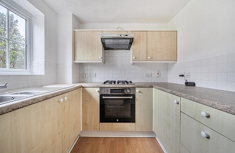 The kitchen is fitted with a range of wall and base units and includes a built-in oven and hob, with space for additional appliances.