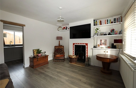 Upstairs, the landing provides access to two bedrooms and a modern bathroom with a rainfall shower over the bath. The principal bedroom features fitted wardrobes either side of the chimney breast along with an over-stairs cupboard. The second bedroom is a versatile single room or as a study. Both bedrooms enjoy exposed wooden floors.