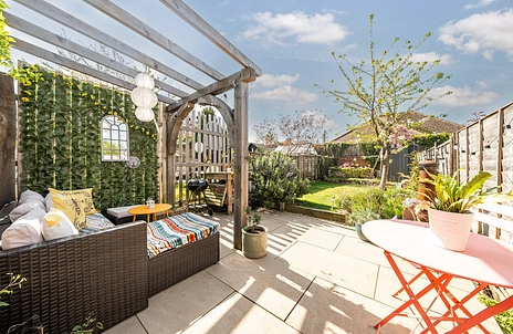 The rear garden is surprisingly generous, offering a paved patio area, a pergola and a good-sized section of lawn, all enclosed by timber fencing. Further benefits include double glazing throughout and gas central heating.