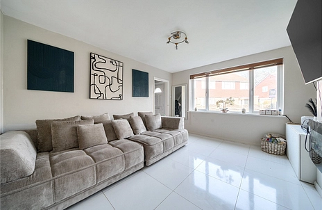 To the rear, the contemporary kitchen has been thoughtfully designed with sleek white handleless cabinetry and complementary worktops. Marble-effect white tiling enhances the modern finish, while integrated appliances include an oven, hob with extractor, and microwave. There is ample space for a washing machine, tumble dryer, and an American-style fridge freezer. Patio doors open directly onto the rear garden, allowing for plenty of natural light and seamless indoor-outdoor living.