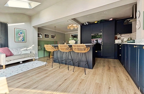 The property has been greatly improved by the current owners and offers surprising accommodation across two floors. The ground floor features an entrance lobby for coats and shoes, a cloakroom/WC, bay-fronted living room overlooking the front garden, study, and extended kitchen dining room. This room boasts a part-vaulted ceiling, bi-folding doors into the rear garden, an island/breakfast bar, and modern fitted kitchen. Integral appliances include a fridge freezer, dishwasher, high-level fan assisted oven and multi-oven/microwave, hob and cooker hood. Upstairs there are three good-size bedrooms (all large enough for doubles) a central landing, and modern family bathroom.
