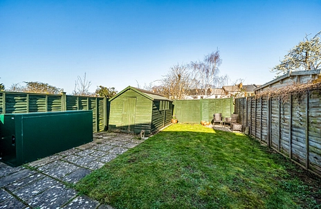 Outside, the rear garden is privately enclosed and features a paved area, lawn, and a pebbled corner area ideal for seating. A wooden gate provides access to the side and front of the property. There is also a useful timber shed and an external storage unit. The hardstanding front garden and driveway provide enough space for two vehicles.