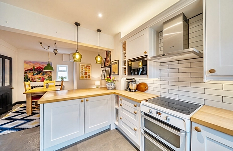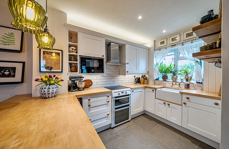 Downstairs, the property offers a spacious kitchen-diner fitted with a cream shaker-style kitchen and oak worktops. A Belfast sink overlooks the garden, and the kitchen includes a built-in microwave, space for a freestanding oven with extractor above, and a breakfast bar. Heritage limestone flagstones run throughout the kitchen-diner and flow seamlessly into the sitting room. There is ample space for a dining table with feature lighting above.