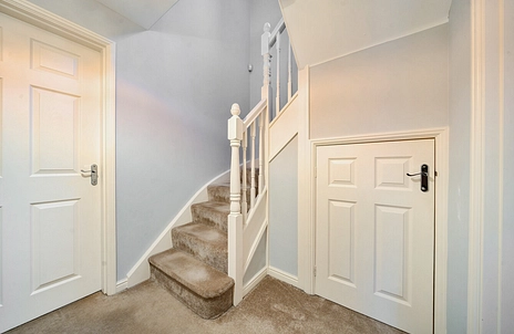 Upstairs, the primary bedroom is a generous size and features his and hers wardrobes along with a private en-suite shower room. There are two further well-proportioned bedrooms, serviced by a modern family bathroom. The first floor also benefits from a large cupboard incorporating the airing cupboard, which could easily be utilised as additional storage or adapted for use as a small home office.