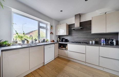 The heart of the home is the stunning kitchen diner to the rear, thoughtfully designed with both style and functionality in mind. Featuring sleek, neutral cabinetry complemented by grey wood-effect worktops and matching splashback, the space is further enhanced by engineered oak flooring that flows seamlessly from the hallway. The kitchen is well-equipped with a large gas hob and extractor fan, built-in double oven, and space for a dishwasher or washing machine, as well as a fridge freezer. Patio doors open directly onto the garden, making it perfect for entertaining and everyday living.