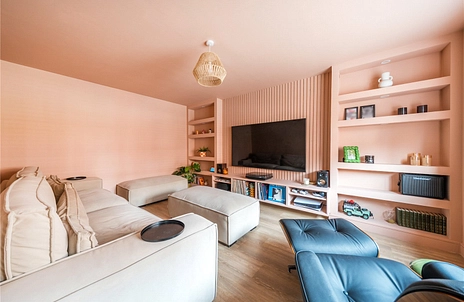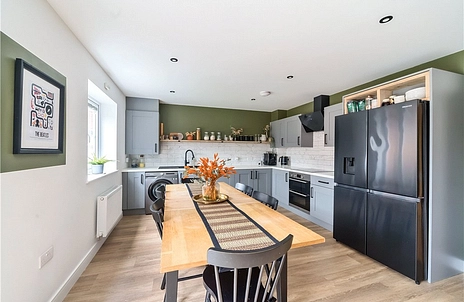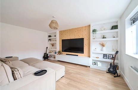 On entering the property, you are greeted by a spacious entrance hall which sets the tone for the rest of the property. Situated at the front of the property, the living room is spacious and features a stylish media wall with shelving. The bright and airy Kitchen-Diner boasts Shaker style cabinets, integrated dishwasher, oven, and hob. There is ample space for an American fridge freezer and a large dining table. Patio doors open out to the garden, making it an ideal space for entertaining and family gatherings. A downstairs WC completes the ground floor.
