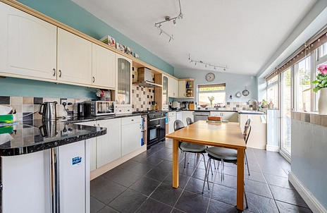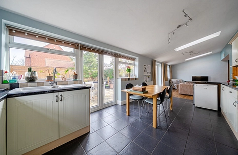 The heart of the home is undoubtedly the impressive kitchen/dining/family room to the rear, spanning the full width of the property and measuring an exceptional 34’2” x 10'5". Designed with family living and entertaining in mind, this space also enjoys the comfort of underfloor heating. The kitchen is fitted with a vast amount of cream cabinetry and offers space for a range cooker, fridge, freezer and dishwasher. Two sets of patio doors open directly onto the garden, while Velux windows allow natural light to flood the space, creating a bright and welcoming atmosphere.