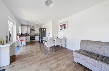 The ground floor is thoughtfully designed with a separate office, ideal for home working, a large sitting room for relaxing, and a convenient downstairs WC. The heart of the home is the expansive kitchen-diner family room, which spans the width of the property at the rear. The sleek, modern kitchen is fitted with glossy white cabinets, an integrated dishwasher, oven, and hob. There's also space for a washing machine and fridge-freezer. Double patio doors lead out to the private rear garden, featuring a patio seating area perfect for entertaining, and a lawned area. There is gated access to the driveway and a side door leading into the garage.