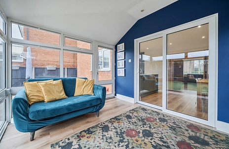 At the heart of the home is a striking modern open-plan kitchen/dining room finished with granite worktops, dedicated pantry storage and a comprehensive range of integrated appliances, including a Quooker boiling tap. To the front, a generous bay-fronted sitting room provides a comfortable reception space, while to the rear, a solid roof conservatory overlooks the south-facing garden. A cloakroom, a substantial utility room and downstairs WC further enhance the practicality of the ground floor layout. High-quality flooring runs consistently throughout the entire ground floor, enhancing the sense of flow between the living spaces.