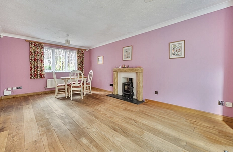 The ground floor features a welcoming entrance hall leading to a large dual-aspect living room with oak flooring and a wood-burning stove, creating a warm and inviting space for relaxing or entertaining. French doors open into a conservatory, ideal for enjoying the garden views year-round.