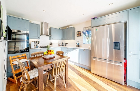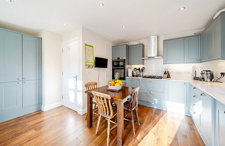The modern Shaker-style kitchen is a real highlight, fully equipped with high-quality appliances, including a double oven, gas hob, integrated dishwasher, and space for a large American-style fridge freezer. The kitchen has been thoughtfully designed with a utility cupboard with space for a washing machine. The open-plan design flows seamlessly, with space for a dining table, perfect for family meals and social gatherings. Patio doors open to the garden, making this space ideal for outdoor dining and entertaining. A convenient WC completes the ground floor accommodation.